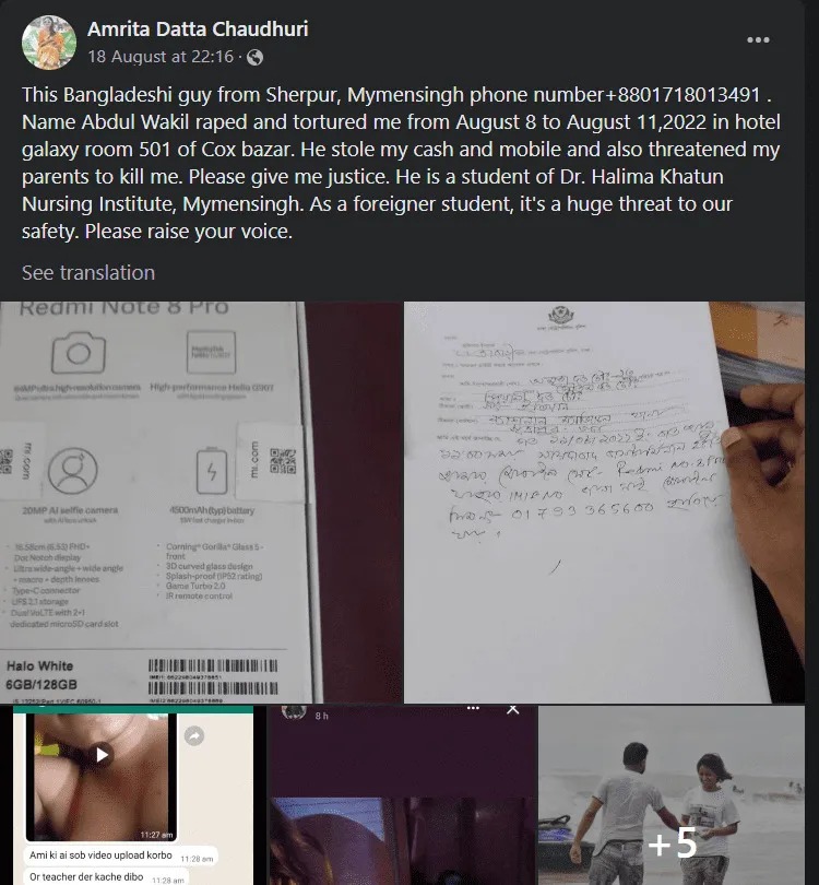 पीड़िता ने फेसबुक पर बताया, “अब्दुल वकील ने कॉक्स बाजार के होटल गैलेक्सी रूम 501 में 8 अगस्त से 11 अगस्त, 2022 तक मेरे साथ बलात्कार किया और मुझे प्रताड़ित किया। अब्दुल ने मेरा मोबाइल और मेरे पैसे भी चुरा लिए थे। वह मुझे और मेरे माता-पिता को जान से मारने की धमकी भी दे रहा है। कृपया मुझे न्याय दें। वह डॉ हलीमा खातून नर्सिंग इंस्टीट्यूट, मेमनसिंह का छात्र है। एक विदेशी छात्र के रूप में यह हमारी सुरक्षा के लिए बहुत बड़ा खतरा है। कृपया अपनी आवाज उठाएँ।”
