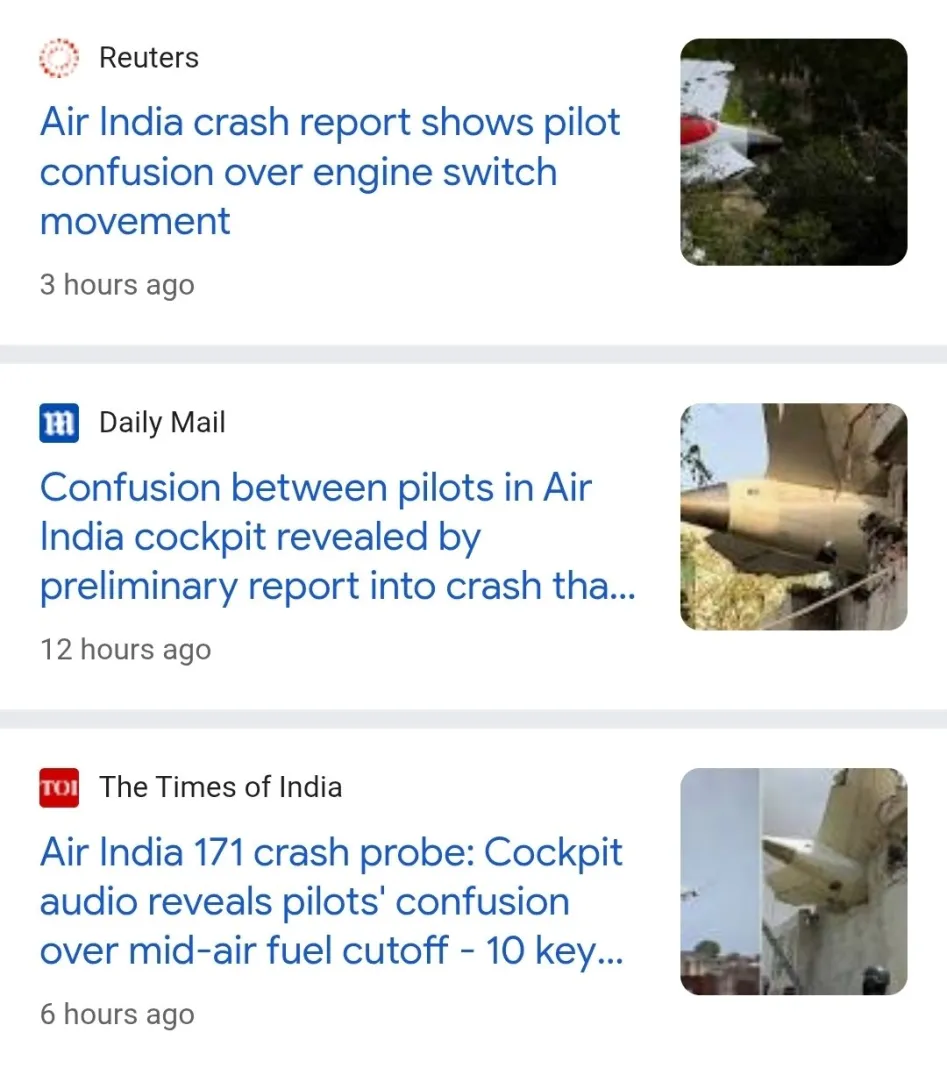 मीडिया रिपोर्ट्स में यह दिखाया जा रहा है कि कॉकपिट में असमंजस की स्थिति बनी और प्लेन क्रैश पायलटों की गलती से हुआ, जबकि असल में दोनों पायलटों ने फ्यूल स्विच बंद करने से इनकार किया। रिपोर्ट में भी तकनीकी खराबी की आशंका जलाई गई है।