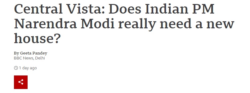 जैसा कि कॉन्ग्रेस के कथित टूलकिट में ‘सेंट्रल विस्टा’ प्रोजेक्ट को बदनाम करने और उसकी आलोचना करने के लिए कहा गया है, बीबीसी में हाल ही में एक लेख प्रकाशित किया गया जिसका शीर्षक था, “क्या भारतीय प्रधानमंत्री नरेंद्र मोदी को वाकई एक नए घर की जरूरत है?” शीर्षक से ऐसा लगता है कि जैसे सेंट्रल विस्टा मात्र पीएम मोदी के नए घर को बनाने का एक प्रोजेक्ट है जबकि वास्तव में इस प्रोजेक्ट के अंतर्गत नई संसद, उपराष्ट्रपति के घर और कई बहुमंजिला कार्यालयों का निर्माण किया जाना है।