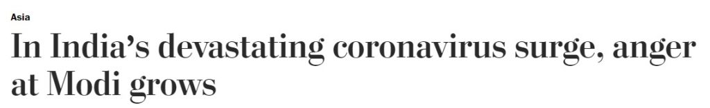वाशिंगटन पोस्ट में अप्रैल 2021 में प्रकाशित लेख में लिखा गया कि जब देश में कोरोना वायरस का संक्रमण तेजी से फैल रहा था तब नरेंद्र मोदी चुनावी रैलियाँ कर रहे थे और गंगा किनारे आयोजित हुए एक बड़े त्यौहार को रोकने में कोई रुचि नहीं दिखा रहे थे जबकि सही तो यह है कि पीएम मोदी ने स्वयं धर्मगुरुओं और मठाधीशों से बात करके कुंभ को सांकेतिक रूप से मनाए जाने का अनुरोध किया था जिसे मान भी लिया गया था।