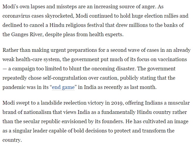इसी लेख में यह भी कहा गया था कि जब देश में स्वास्थ्य सुविधाओं को बढ़ाने की आवश्यकता थी तब मोदी सरकार टीकाकरण पर फोकस कर रही थी और खुद को ही शाबाशी दे रही थी। इस लेख में भी कहा गया कि मोदी ने 2019 की प्रचंड जीत के बाद भी भारतीयों को सेक्युलर गणतांत्रिक भारत की जगह एक ऐसे राष्ट्रवाद का स्वप्न दिया जो भारत को हिन्दू राष्ट्र के रूप में देखता है।