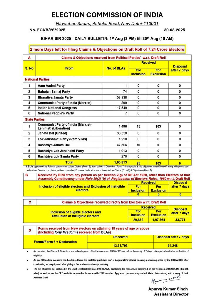 इस बुलेटिन के मुताबिक, 1 अगस्त से 30 अगस्त तक ड्राफ्ट रोल पर दावे और आपत्तियों की प्रक्रिया में सिर्फ 2 दिन बचे हैं और जो आँकड़े सामने आए हैं, वे चौंकाने वाले हैं। आइए, इस रिपोर्ट में हर पहलू को विस्तार से समझते हैं, ताकि जनता को सचाई का पता चले।