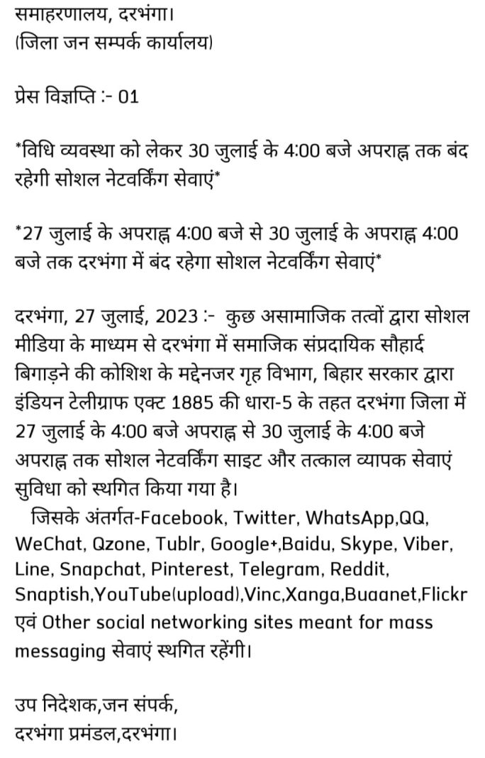इसमें बताया गया है कि कुछ असामाजिक तत्व सोशल मीडिया के जरिए दरभंगा में सांप्रदायिक सौहार्द बिगाड़ने की कोशिश कर रहे हैं। इसे देखते हुए राज्य के गृह विभाग के निर्देश पर ये सेवाएँ स्थगित करने का निर्णय लिया गया है। फेसबुक, ट्विटर, व्हाट्सऐप, यूट्यूब पर वीडियो अपलोड करने सहित सोशल नेटवर्किंग की तमाम सेवाओं पर यह बंदिश लागू है।