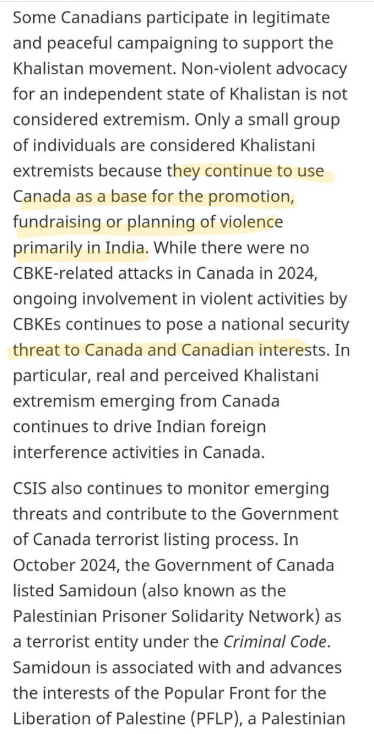 साल 2024 की इस रिपोर्ट में स्पष्ट तौर पर कहा गया है, “खालिस्तानी चरमपंथी मुख्य रूप से भारत में हिंसा को बढ़ावा देने, धन जुटाने या योजना बनाने के लिए कनाडा को इस्तेमाल किया जा रहा है।”