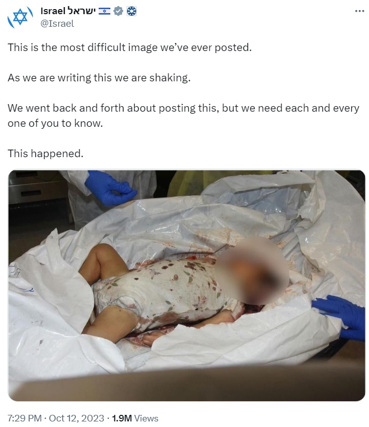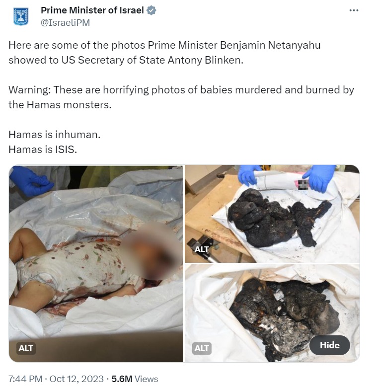 डायपर पहने बच्चे की मौत अकेली नहीं है। हमास के इस्लामी आतंकियों ने नवजात शिशुओं तक को जला कर मार डाला है। यह सूचना भी आधिकारिक है। इजरायल के प्रधानमंत्री के X हैंडल से शेयर की गई है, अमेरिका के विदेश मंत्री एंटनी ब्लिंकन को भी ये सारी तस्वीरें दिखाई गई हैं।