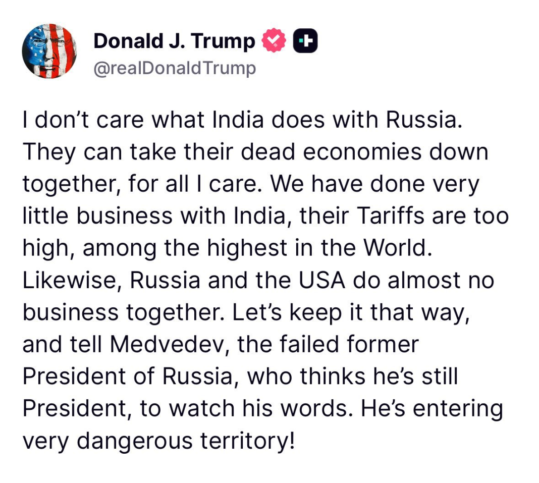 अमेरिका के राष्ट्रपति डोनाल्ड ट्रंप ने भारत पर बुधवार (30 जुलाई, 2025) को 25% टैरिफ का ऐलान किया था। ट्रंप ने इसी के साथ कहा था कि भारत के रूस से हथियार सौदों और तेल-गैस खरीदने के चलते भारत अपर अतिरिक्त टैरिफ भी लगेगा। ट्रंप ने इसके बाद गुरुवार (31 जुलाई, 2025) को भारत और रूस को ‘डेड इकॉनमी’ बता दिया। उनका इशारा था कि दोनों देश एक साथ हैं और अब वह जो चाहें वो करें।