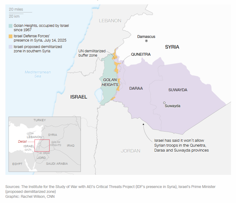 इजरायल का मकसद कोई क्षेत्र छीनना नहीं है, बल्कि यह सुनिश्चित करना है कि उसके दुश्मन इन इलाकों पर प्रभावी न हों। फिलहाल अमेरिका के राजदूत टॉम बैरक ने जानकारी दी है कि इजरायल और सीरिया ने युद्ध विराम पर सहमति जताई है। लेकिन इजरायल ने साफ कहा है कि अगर ड्रूज समुदाय पर दोबारा हमला हुआ, चाहे वो हमला उसकी सीमाओं के बाहर ही क्यों न हो तो वह सैन्य कार्रवाई करेगा।