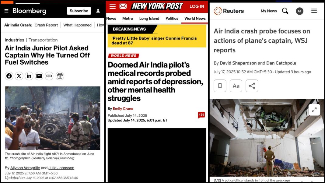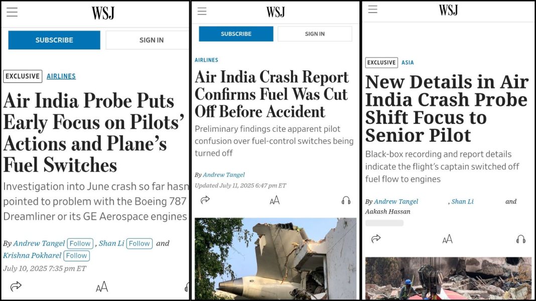 WSJ समेत तमाम संस्थानों ने अब पायलटों को अंतिम तौर पर पायलटों को दोषी ठहरा दिया ही है। हालाँकि इसकी पटकथा कई दिनों पहले से ही लिखी जा रही थी। अमेरिकी अखबार WSJ ने गुरुवार (10 जुलाई,2025) को इसी संबंध में एक खबर प्रकाशित की थी। इस खबर में दावा किया गया था कि जाँचकर्ता अब एअर इंडिया हादसे की जाँच इंजन या अन्य फेलियर के एंगल से नहीं परंतु पायलटों की ‘भूल’ के एंगल से कर रहे हैं।