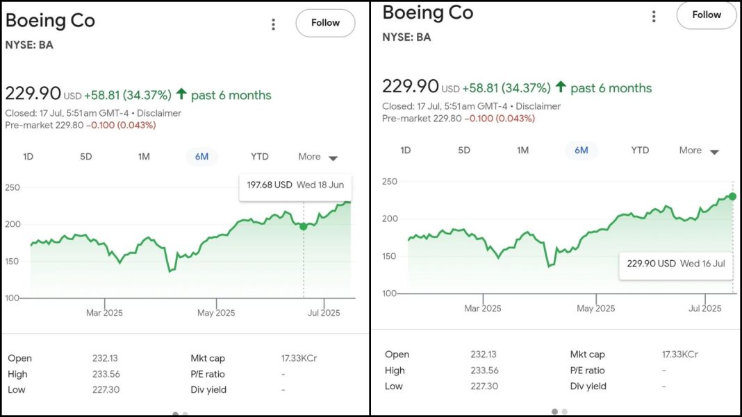 अहमदाबाद में विमान हादसे, इसकी जाँच और इससे जुड़ी रिपोर्ट्स का सीधा असर बोइंग के शेयर पर दिख रहा है। जब 12 जून, 2025 को हादसा हुआ था तो बोइंग के शेयर ने तेज गोता लगाया था। हादसे के दौरान जिस बोइंग का शेयर $215 से गोता लगाते हुए सीधे तौर पर $198 तक आ गया था। लगभग 7%-8% की यह गिरावट बोइंग के लिए एक बड़ा झटका थी। हालाँकि, इसके बाद जैसे ही बोइंग हादसा मामले में पायलटों पर दोष मढ़ा जाना चालू हुआ, इसका शेयर वापस चढ़ने लगा।