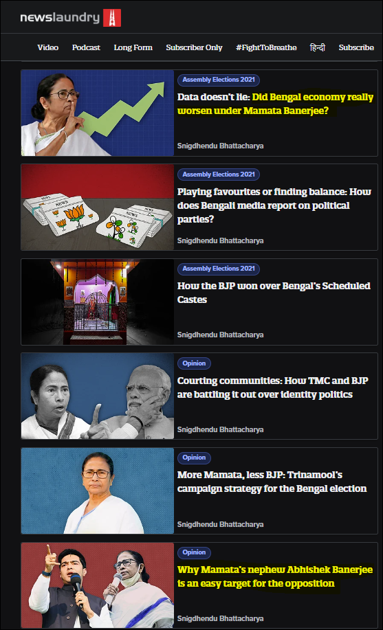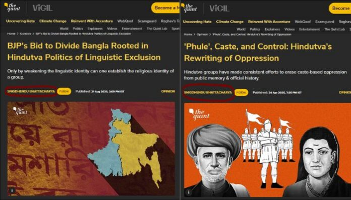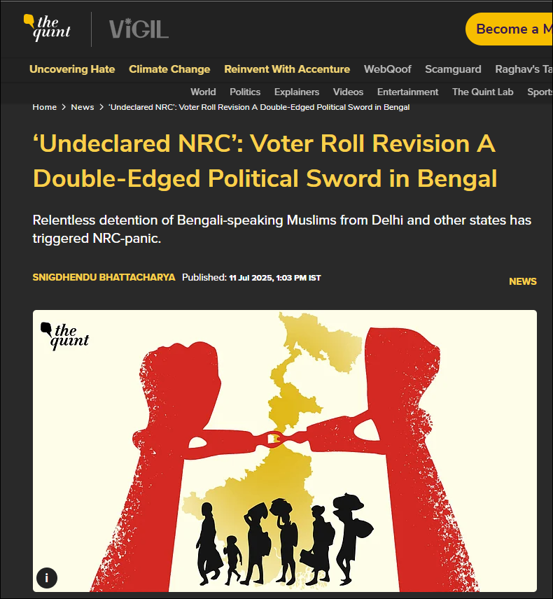 इसके बावजूद द वायर, न्यूजलॉन्ड्री, द क्विंट और आर्टिकल-14 जैसे प्लैटफॉर्म्स के लिए लिखने वाले स्निग्धेंदु भट्टाचार्य ने आधिकारिक आँकड़ों या सुप्रीम कोर्ट की निगरानी को तवज्जो देने के बजाए कुछ चुनिंदा उदाहरणों और TMC जैसे दलों के सूत्रों पर ज्यादा भरोसा किया। यहाँ तक कि द क्विंट में अपने एक आर्टिकल में उन्होंने बंगाल के SIR अभियान को ‘घोषित किए बिना लागू किया NRC’ तक बता दिया।