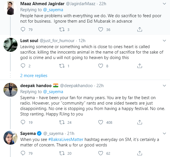 आरजे सायमा इसी ट्वीट के जवाब में लिखती हैं कि जब आप सोशल मीडिया पर #Bakralivesmatter जैसा हैशटैग हर रोज देखते हैं तो ये निश्चित तौर पर चिंता का विषय हो जाता है।