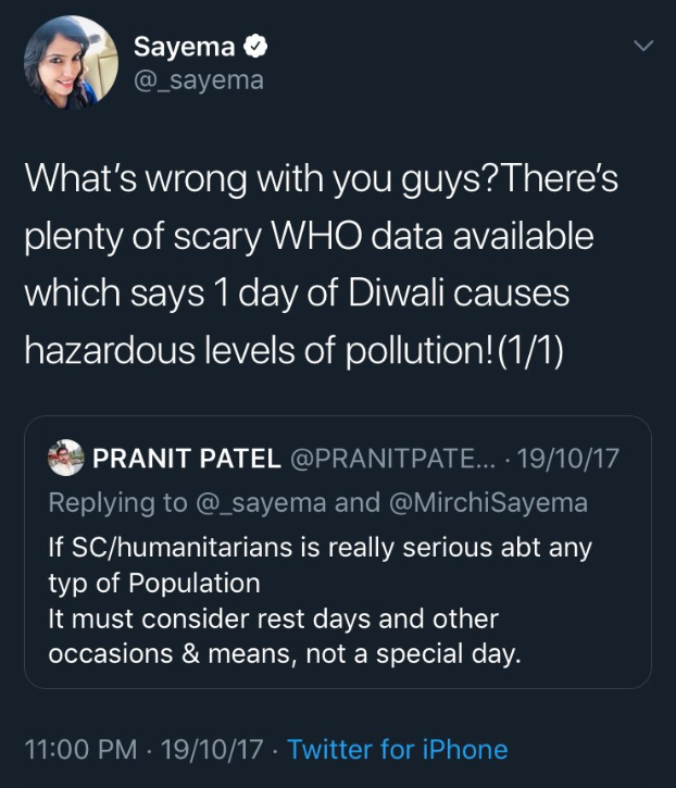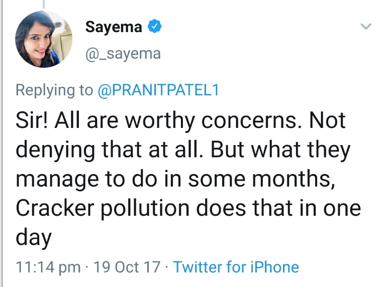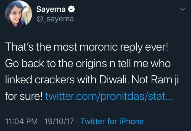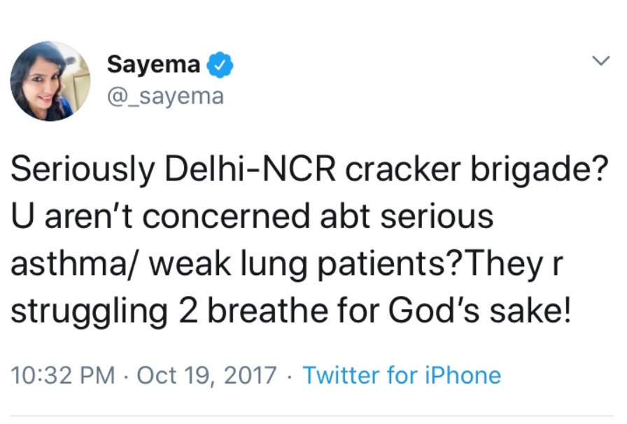 जो इवन डेज में आपको दिवाली-होली पर पॉल्यूशन और पानी पर ज्ञान देने के लिए उकसाता है, जबकि ऑड दिनों में ये कहलवाता है कि बकरीद को शांति से मनाने दिया जाए। दिवाली पर सायमा जैसों को फौरन उन लोगों की चिंता सता जाती है जिन्हें धुएँ से परेशानी होती है। क्या उनका विवेक उन्हें उन लोगों के लिए आवाज उठाने को नहीं बोलता जिन्हें खून से भरी नालियाँ देखकर घबराहट शुरू हो सकती हैं।